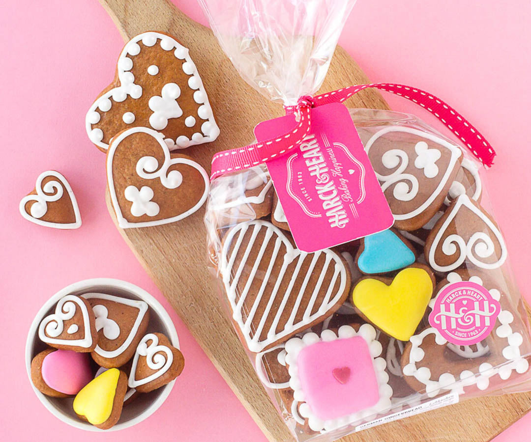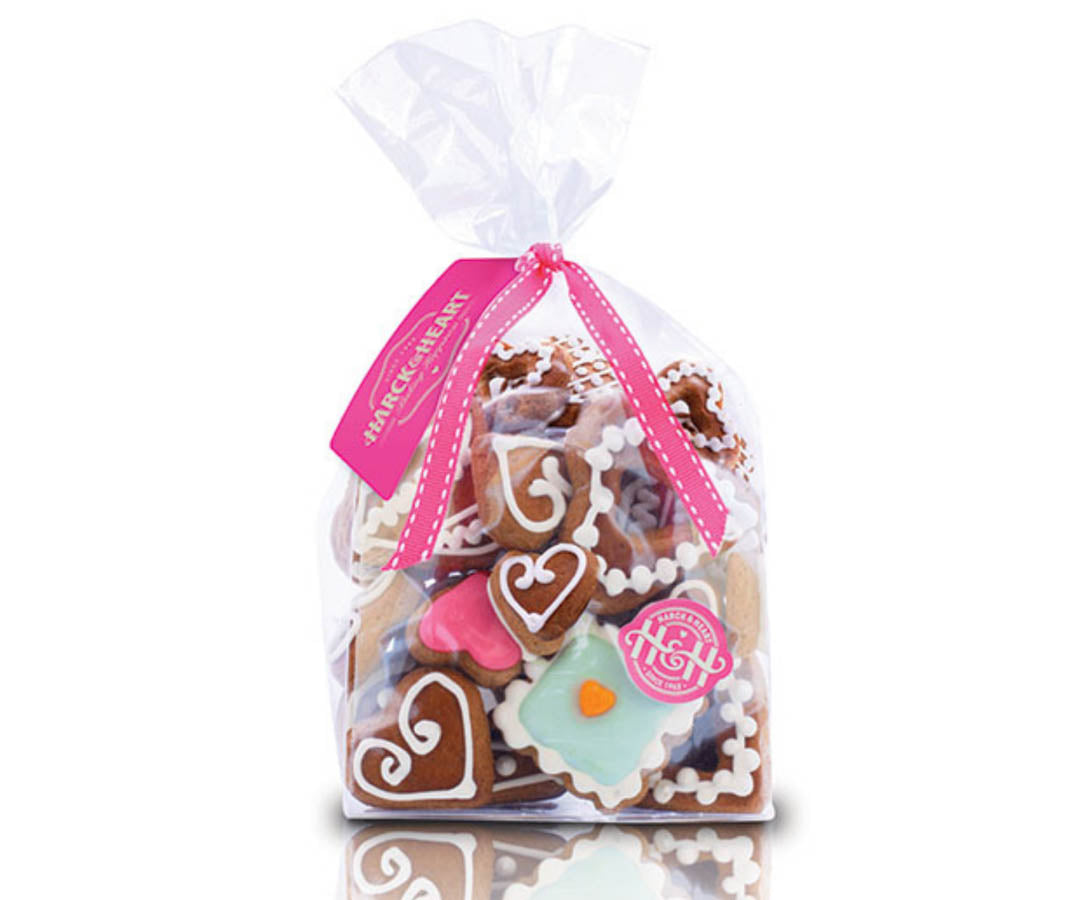 • An assortment of heart shaped biscuits (220g) decorated with white icing. Each packet contains three biscuits with colour detail. Packet finished off with pink ribbon and tag.