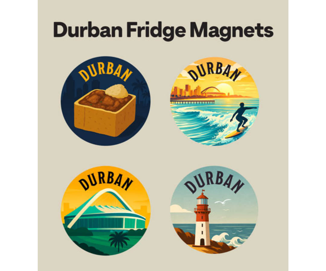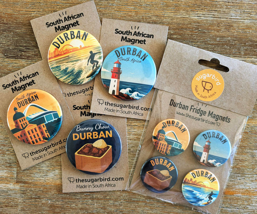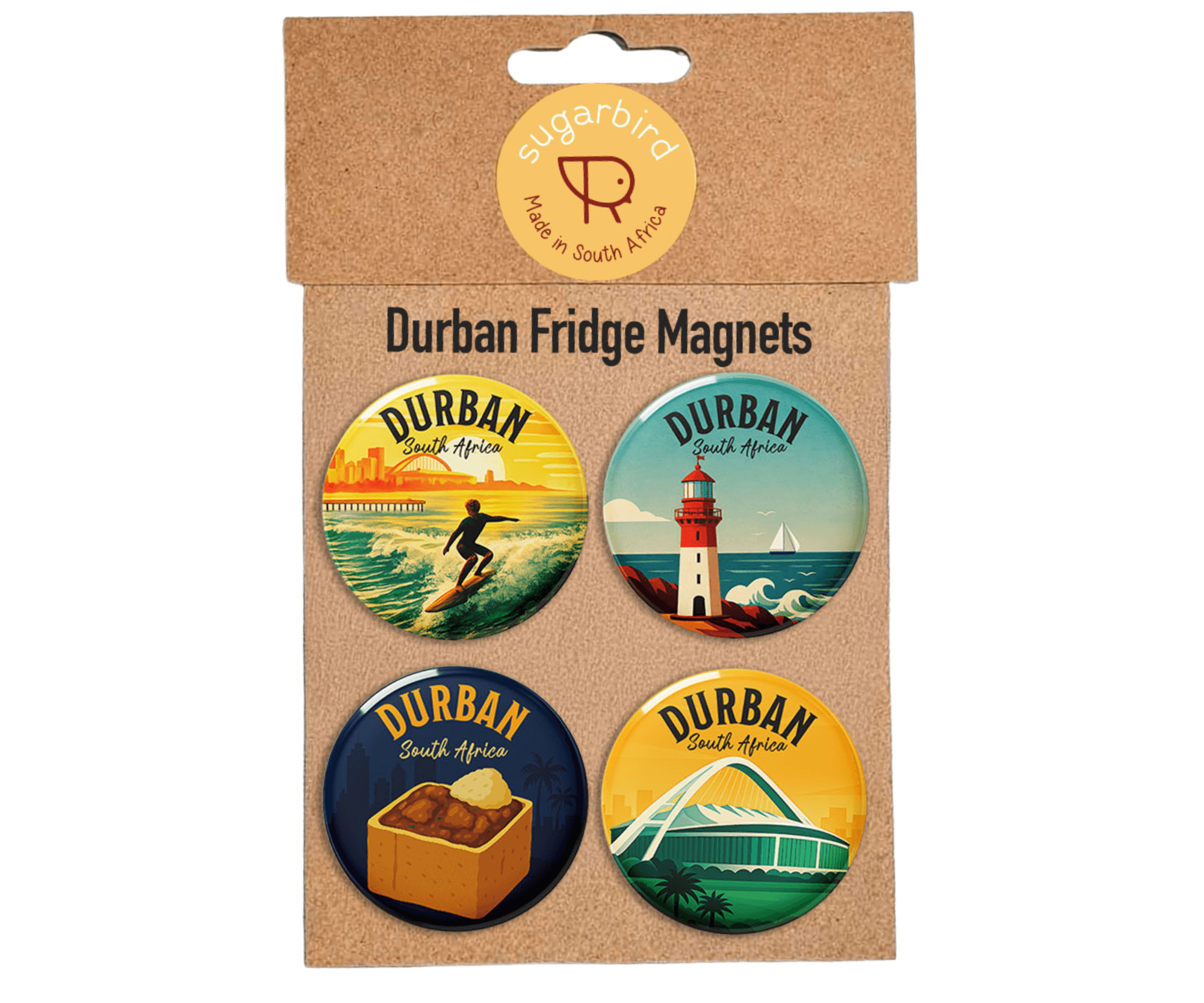 • Set of 4 Durban 35mm round fridge magnets. Larger single fridge magnets are also available separately.