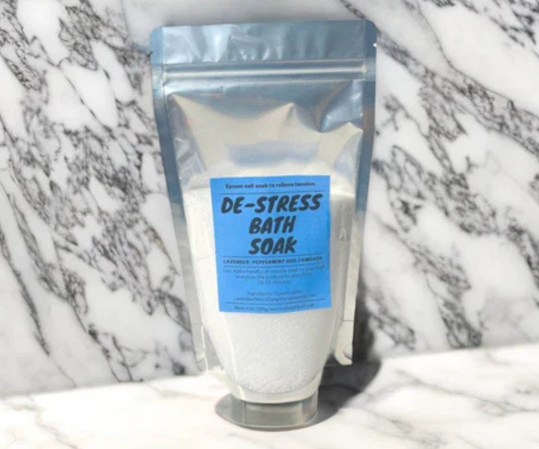 • Unwind and relax with our De-Stress Bath Soak. This unique blend of epsom salts and essential oils, including orange, lavender, and sandalwood, will help relieve tension and leave you feeling refreshed. Take a bath and de-stress!