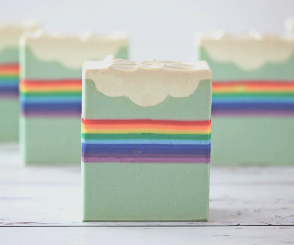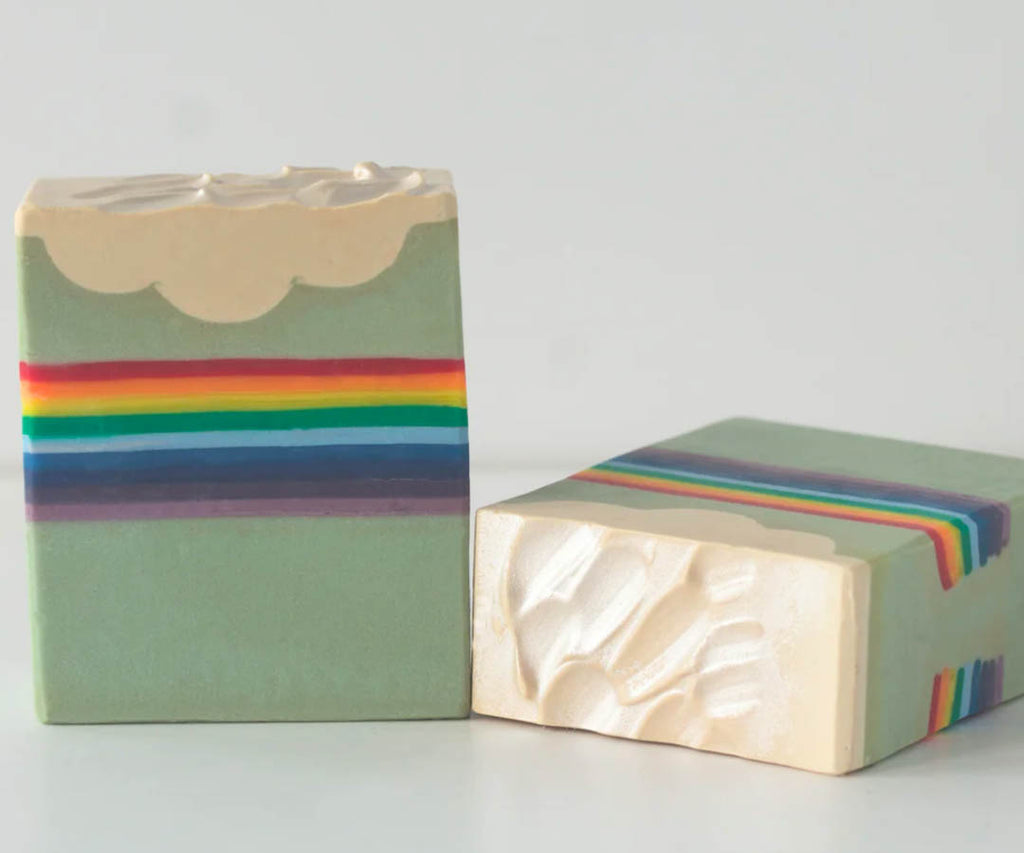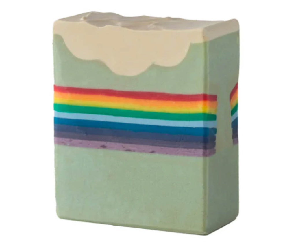• This bar is crafted with extra‑virgin olive oil and rich butters, producing a creamy, skin‑loving lather. Its pastel blue base, embedded prism‑rainbow, and soft white cloud top make it a miniature work of art—but the true luxury is in the generous fragrance and decadent ingredients that transform daily washing into an unforgettable ritual.