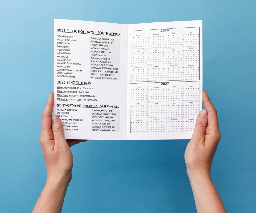 • SA public holidays included in every month and school terms listed in the front. Noteworthy international observances listed. 2026 and 2027 full year calendars.