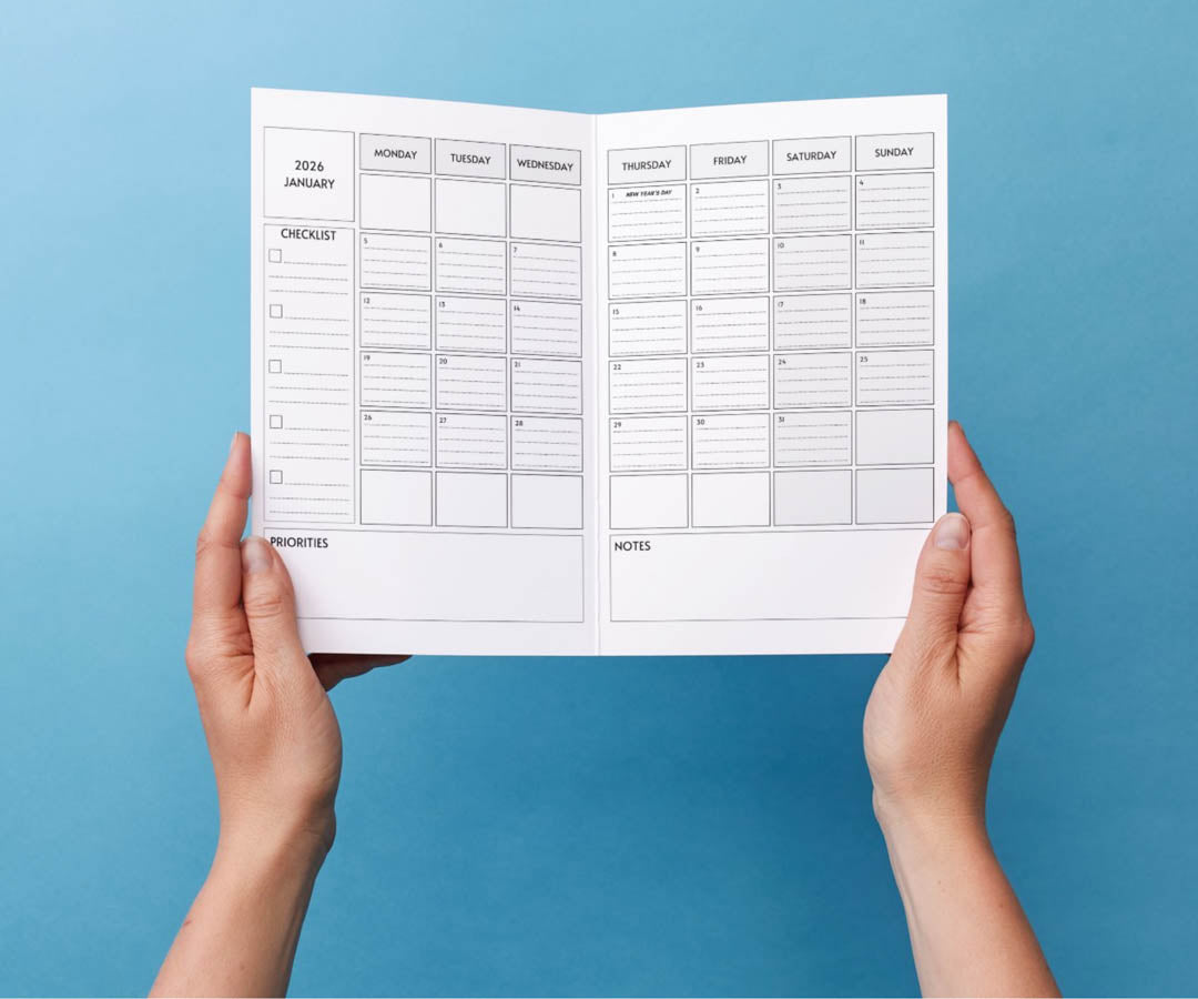 • Monthly calendar that opens up to A3 size. Monthly checklist and space for notes & priorities. Space for notes & doodles at the back of the book.
