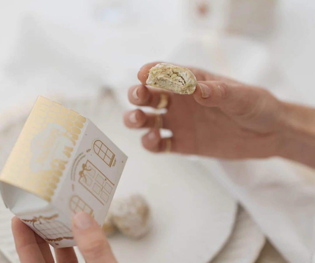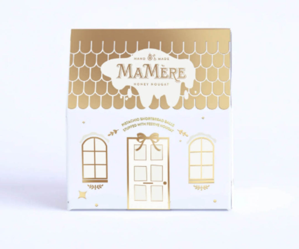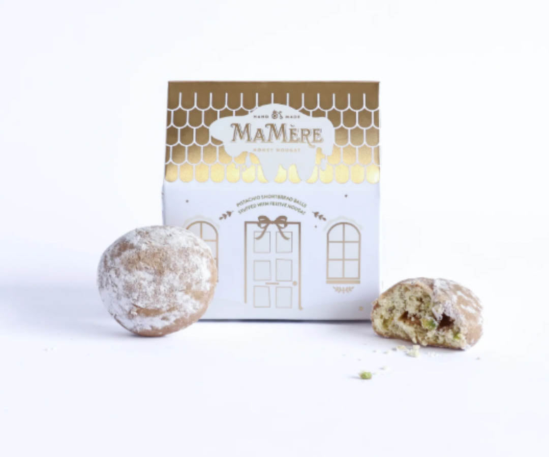 • A charming festive gift in a keepsake house box, holding 3 delicate pistachio shortbread snowballs filled with festive nougat. Perfect as a stocking filler, table favour, or a sweet little gesture of joy. Contains 3 x Pistachio Shortbread Snowballs stuffed with Festive Nougat.
