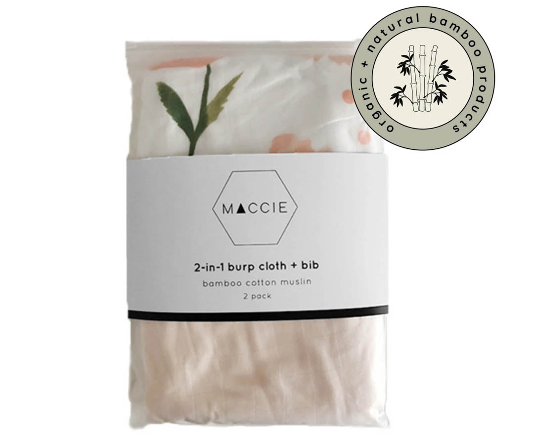 • Made from two layers of 70% bamboo and 30% cotton muslin, the MACCIE 2-in-1 burp cloth + bib set keeps moms and little ones clean from drips, drool, spit-up, and spills. The contoured cloth sits perfectly on mom’s shoulder when burping and easily transforms into a full-coverage bib that drapes over baby’s shoulders with a simple snap of the press stud.