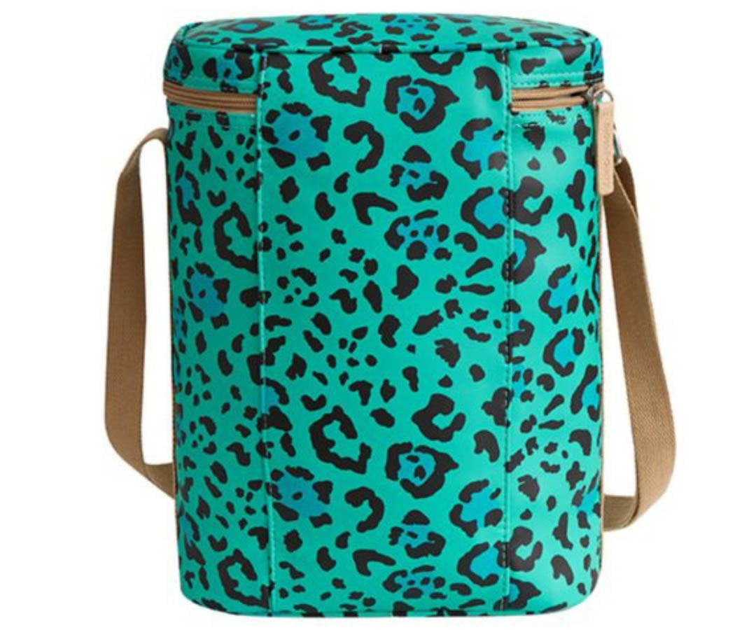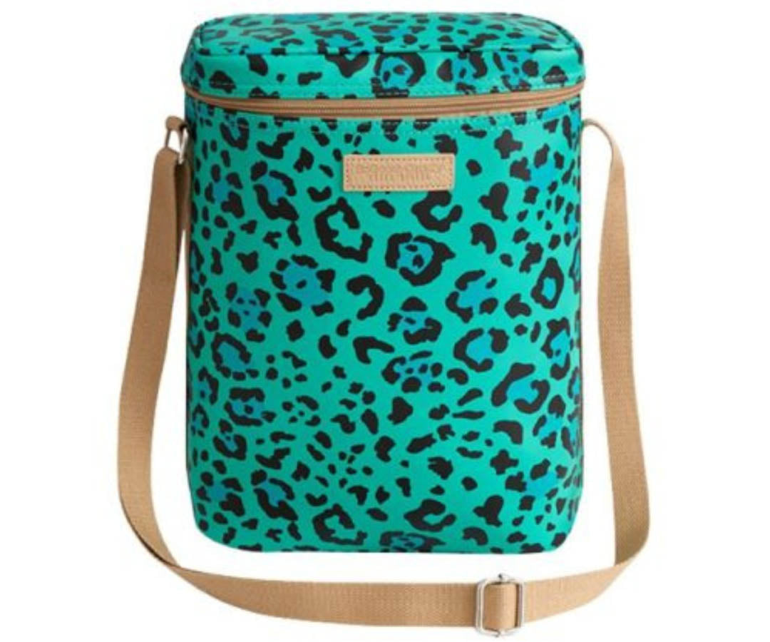 • This PU wine bag with an aqua cheetah print features an insulated reflective foil liner to keep your beverages cool. Featuring ample space and medium-length cotton webbing handles.