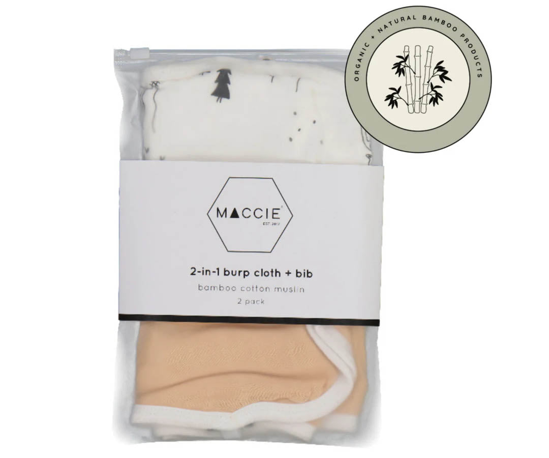 • Made from two layers of 70% bamboo and 30% cotton muslin, the MACCIE 2-in-1 burp cloth + bib set keeps moms and little ones clean from drips, drool, spit-up, and spills. The contoured cloth sits perfectly on mom’s shoulder when burping and easily transforms into a full-coverage bib that drapes over baby’s shoulders with a simple snap of the press stud.
